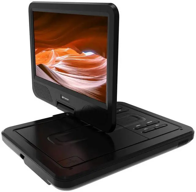 LARGE 10-INCH SWIVEL SCREEN FOR OPTIMAL VIEWING -- The Emerson EPD-1001 features a 10-inch screen that swivels 180 degrees, allowing you to find the perfect viewing angle no matter where you are. ^^ BUILT-IN SPEAKER FOR CLEAR, HIGH-QUALITY AUDIO -- Enjoy crisp sound with the EPD-1001s built-in speaker, delivering an immersive audio experience whether you're watching movies or listening to music. ^^ RECHARGEABLE BATTERY FOR PORTABLE VIEWING -- Take your entertainment on the go with the built-in rechargeable battery, providing hours of viewing time without needing to be plugged in. ^^ REMOTE CONTROL FOR EASY OPERATION -- Navigate your favorite movies and shows effortlessly with the included remote control, offering full access to all features from a distance.