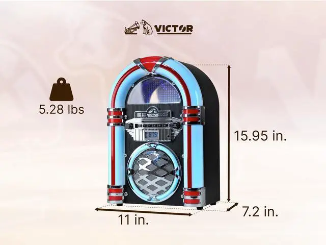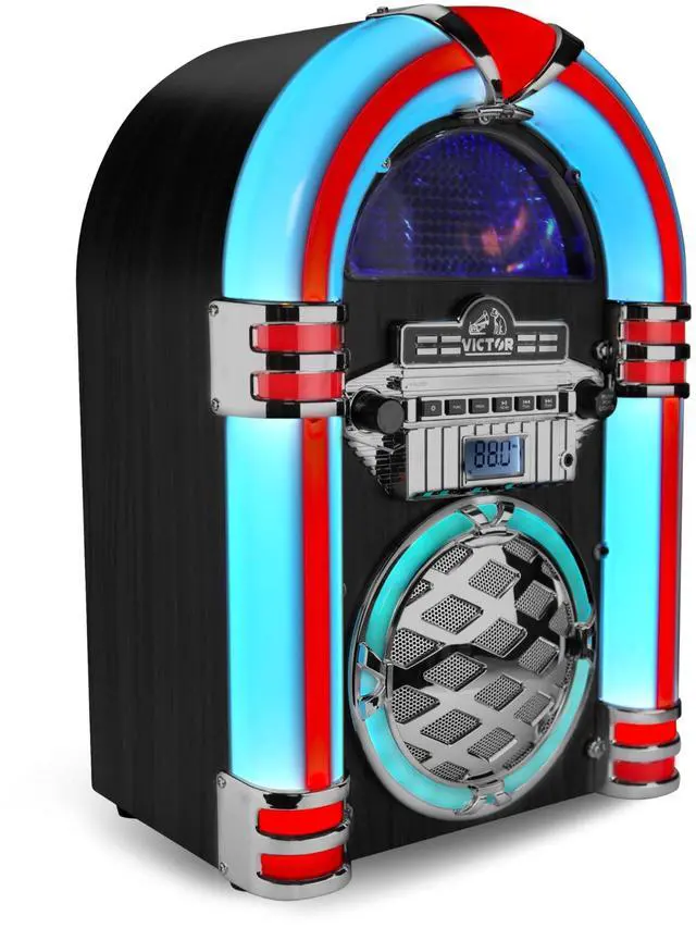 DESKTOP BLUETOOTH JUKEBOX FOR WIRELESS STREAMING -- The Victor VDTJ-1450 allows you to stream music wirelessly from any Bluetooth-enabled device, such as your smartphone or tablet, offering a seamless and convenient listening experience. ^^ FM RADIO FOR CLASSIC BROADCAST LISTENING -- Tune into your favorite FM radio stations with the built-in tuner, providing access to music, news, and talk shows in a retro-style jukebox design. ^^ MULTICOLOR LED LIGHTING FOR AMBIENT EFFECTS -- Featuring dynamic multicolor LED changing lights, the VDTJ-1450 enhances your listening experience with vibrant visual effects, adding a fun and nostalgic touch to any room.