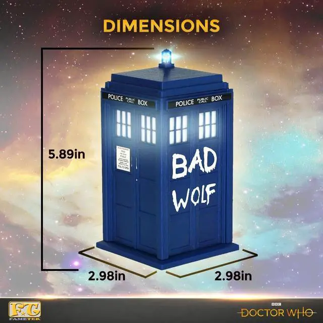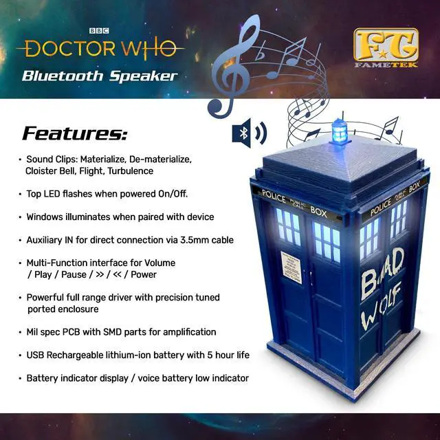 LICENSED DOCTOR WHO COLLECTIBLE: This 6 tall wireless Bluetooth Speaker has show accurate sound clips like materialize, dematerialize, cloister bell, flight, and turbulence! It looks exactly like the TARDIS, thanks to its meticulous craftsmanship and attention to detail. Features a top LED Lamp that flashes when powered On/Off as well as Windows on all 4 sides! ^^