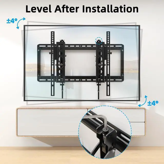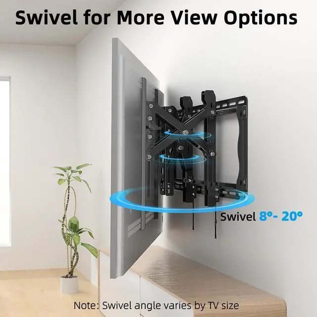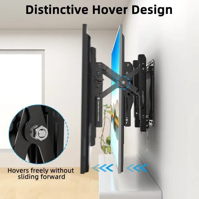 Full Motion with Unique Hovering DesignArticulating arms can extends to 10" or retract 3.15" from the wall, you can adjust the distance freely without sliding by the HOVERING design. Impressive 8-20 left-right swivel further enhances the viewing angle, while the versatile 5 up and 10 down tool-free tilt functions avoid glare from windows or interior lights. Even with off-center studs, centering your TV is no longer a challenge thanks to the side-to-side shift feature. Youll always have the best seat in the house! ^^ Level Adjustment After InstallationPost-installation 4level adjustments make fine-tuning quick and easy for a perfectly leveled TV.