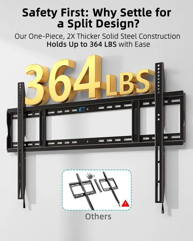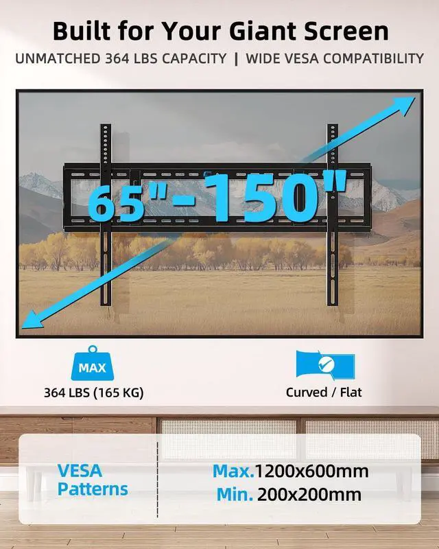 MASSIVE TV SUPPORT UP TO 150" & 364 LBS Engineered for the industry's largest screens, this heavy-duty mount securely supports TVs from 65" to 150" with a massive 364 lbs capacity. It is the ultimate choice for giant displays, including TCL 98/115", Samsung 98", and Sony 100/110" models. With extensive VESA compatibility from 200x200mm up to 1200x600mm (including 1000x600 and 1100x600), its industrial-strength steel construction ensures rock-solid, wobble-free stability for your premium OLED, QLED, and 4K giant-format displays. ^^ ONE-PIECE WALL PLATE MAXIMUM STRUCTURAL RIGIDITY Unlike common two-piece designs prone to alignment errors, our HV8121 features a single-piece, 2mm thick reinforced steel wall plate with fully welded supports.