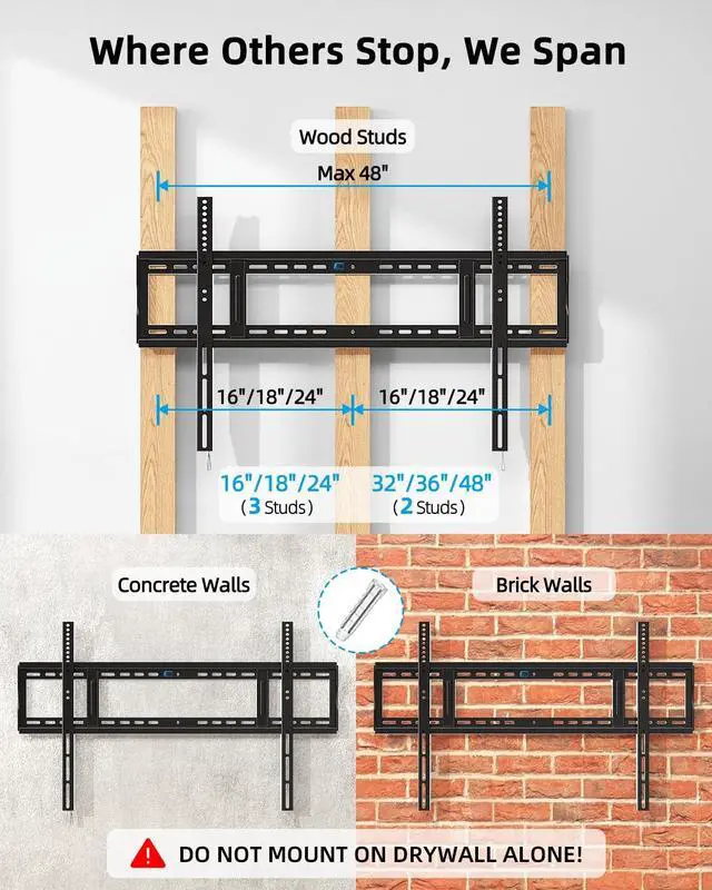 This superior construction eliminates flexing and sagging, providing a safe, stable foundation for your premium, high-value investment. ^^ ULTRA-WIDE STUD SPACING UP TO 48" COMPATIBILITY Specifically designed for complex wall layouts, our extra-long wall plate fits 16", 18", 24", 32", 36", 42", and 48" wood stud spacing. Whether you need a 3-stud heavy-duty install or have non-standard wide studs, this mount offers the most versatile fit on the market without needing extra adapters. ^^ 4 SAFETY TESTED & PERFECT CENTERING Safety is our top priority for your premium display.