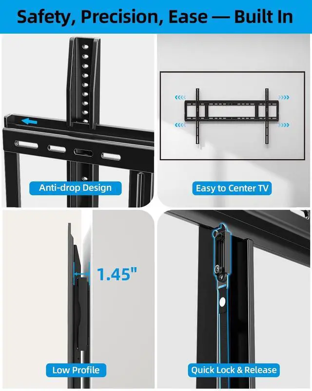 This mount is 4 safety tested to ensure rock-solid, long-term performance under extreme loads. Specifically engineered with an extra-wide wall plate, it features horizontal adjustment for perfect centering, allowing you to shift your TV left or right to achieve the ideal viewing positioneven if your wood studs (up to 48") are off-center or unevenly spaced. ^^ 1.45" LOW PROFILE & 10-YEAR RELIABILITY SUPPORT Achieve a modern, floating aesthetic with a slim 1.45" profile that keeps your massive screen nearly flush to the wall while maintaining proper airflow. Installation is fast and secure on wood studs, concrete, or brick with pre-sorted hardware and pull-strap locks.