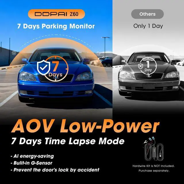 AOV Parking Mode: AI technology enables low-energy time-lapse recording to support up to 7 days of parking surveillance for dashcam front and rear camera. In sleep mode, this drive camera for car can extend parking monitoring for up to 20 days. AOV technology saves energy while instantly waking up to record any abnormal activity. The built-in low-voltage protection system prevents your vehicle's battery from draining.