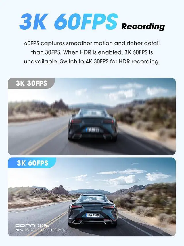 Recording Car Camera: This dual starvis2 car dash cam Z60 Pro link features with 3K@60fps high frame rate mode on the front camera, ensuring smooth and clear footage during high-speed driving, perfect for capturing fast-moving vehicles with precision while reducing motion blur.