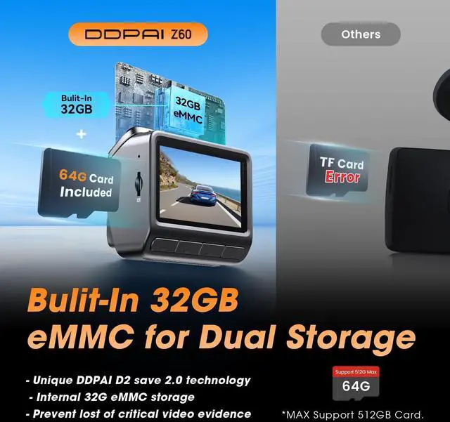 Is DSave 2.0 technology, this 4K dash cam front and rear comes with 32GB eMMC internal storage, which supports an additional TF card (up to 512GB). If your TF card becomes damaged, lost, or misplaced, your dashcam recordings will automatically switch to internal storage, ensuring no critical video evidence is lost ^^ Super AI ISP Night Vision 2.0