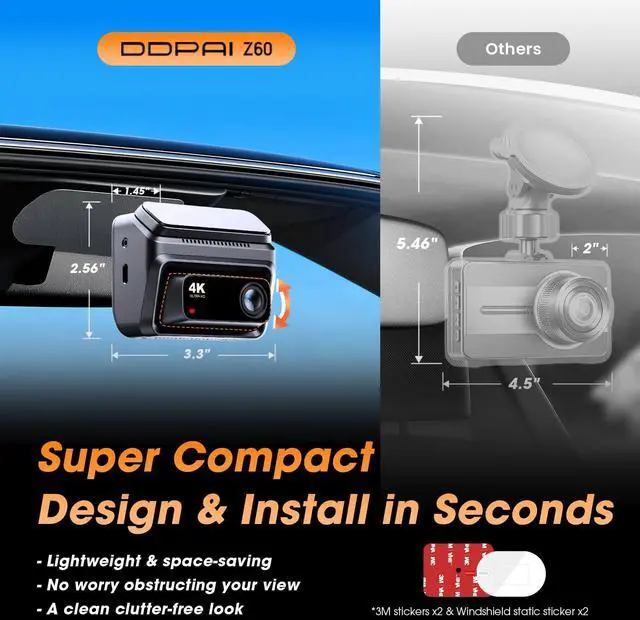 Reliable & Super Capacitor Camera: Vehicle collisions often cause sudden power interruptions. Super capacitor in this DDPAI Z60 car dash camera can still supply power for 3-4 seconds after a power failure, preventing critical video evidence loss. It also ensures reliability and durability in extreme temperatures ^^ ADAS with Voice Reminder 4K Dash Cam.: This car camera is equipped with ADAS, providing reminders whit front starts moving and fatigue driving reminder. This driver fatigue alarm is your safety guarantee for safe and easy driving, especially suitable for long-distance driving or night driving. If the vehicle ahead starts moving, the car dash cam Z60 will alert you to begin driving, helping you avoid being honked at by the car behind