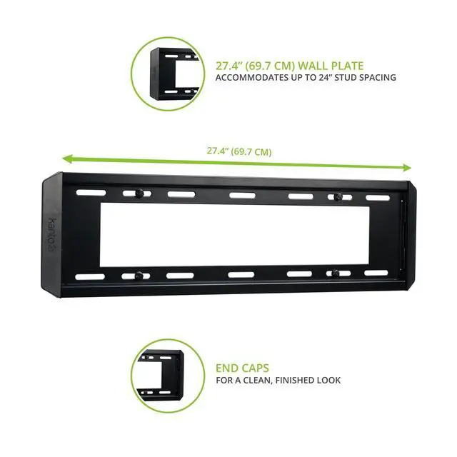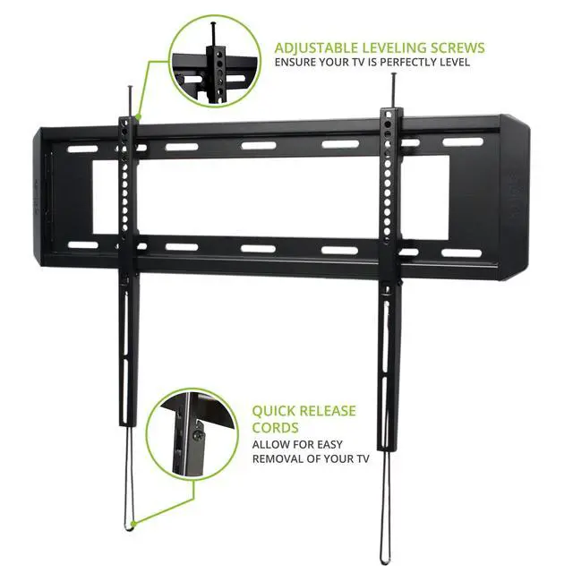 SAFE & SECURE - Supports TVs weighing up to 150 lb, with VESA sizes from 50x50 to 600x400. ^^ LOW-PROFILE DESIGN - Allows your TV to sit 1" from the wall. ^^ HORIZONTAL ADJUSTMENT - Shift your TV left or right across the wall plate to achieve the ideal viewing position. ^^ QUICK-RELEASE CORDS - Pull on the cords to easily detach your TV from the wall plate. ^^ LEVELING SCREWS - Two leveling screws can be adjusted to ensure your TV is perfectly aligned.