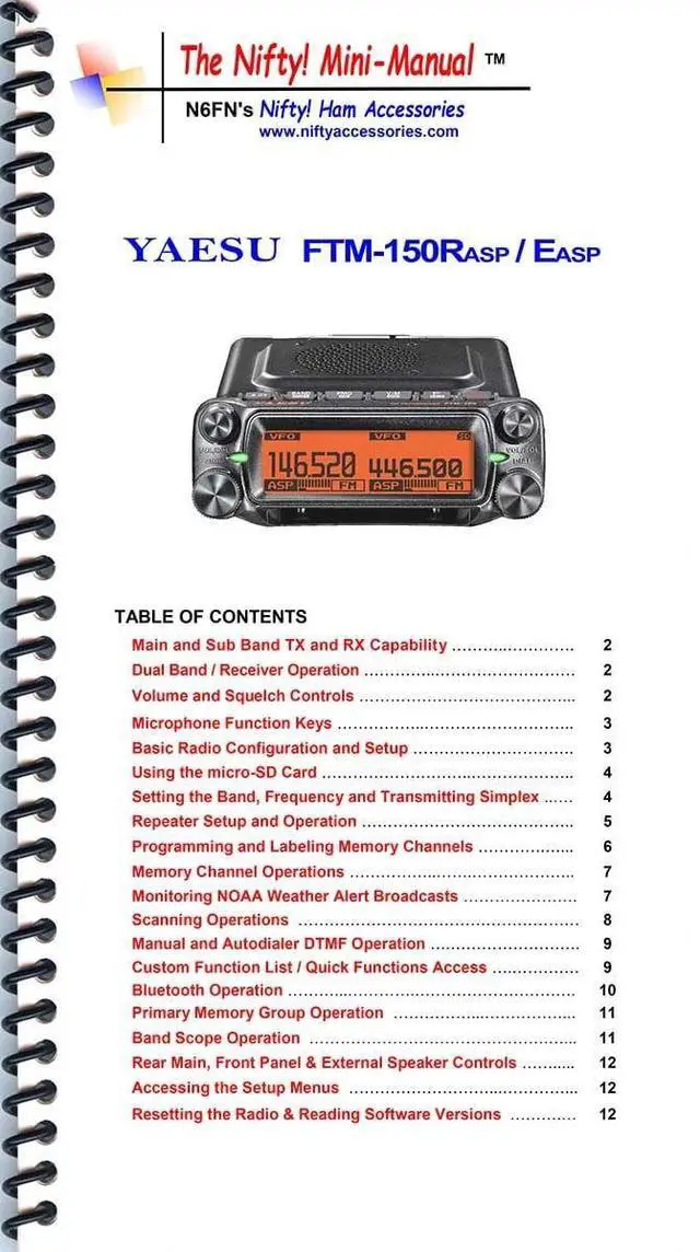 Compact FTM-150RASP Mini-Manual. Size, 4.5 x8 inches. This rugged 12-page high quality printed and laminated operating guide is loaded with simplified instructions for programming and operating this transceiver. This is an ideal short-form guide for setting up and operating the capabilities of the FTM-150R-ASP described in both of Yaesus Basic and Advanced manuals, including the Custom Function List, ASP, micro-SD Card, scanning, memory programming and Bluetooth features. Nifty! Ham Radio Mini-ManualProvides clear descriptions for all controls, setup menus and modes of operation. Simple step-by-step instructions, augmented with useful hints and explanations.