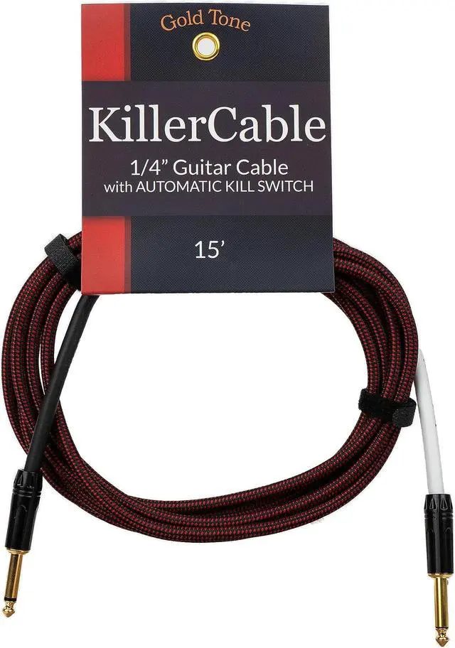 These revolutionary new 1/4" guitar cables eliminate the headaches caused by switching instruments live. The cable automatically cuts the audio signal when plugging and unplugging the jack, so no more popping, crackling or buzzing! 15 feet in length, gold plated jacks, heat shrink reinforced ends, 90% OFC braided wire, vintage woven cloth, and easy grips for plugging and unplugging. It even works on Fender Strats!