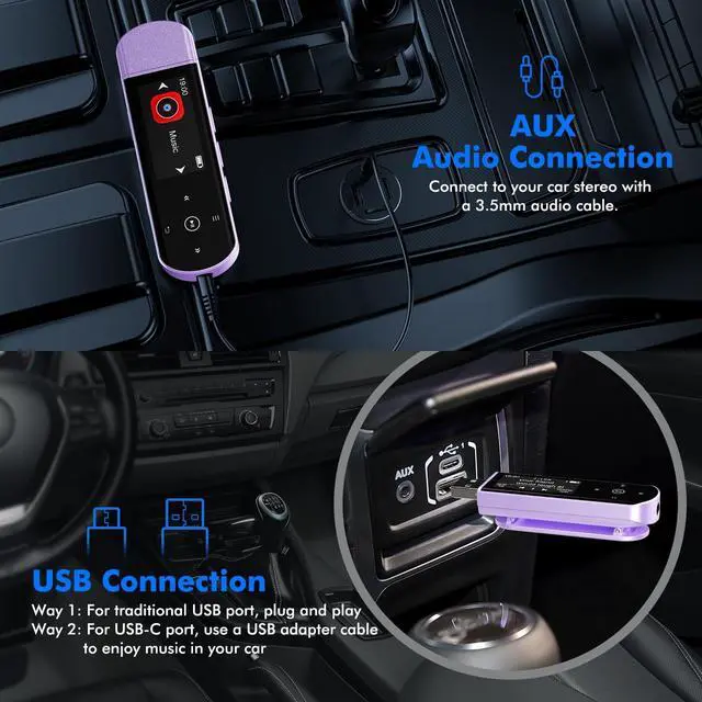 Note: The Bluetooth of the USB MP3 player clip on CAN'T connect to computers, cars, or smartphones ^^ [AUX and USB, Enjoy Music in Car] 3.5 mm AUX port and standard USB plug, the USB MP3 player with Bluetooth seamlessly connects to your car's audio system. Whether you choose the clear, wired sound via AUX (AUX cable not included) or enjoy direct streaming through the USB port, your drives will be filled with crisp, uninterrupted tunes. The USB MP3 player for car is perfect for road trip or daily commute ^^ [Phone File Transfer, 64GB Large Memory, Long Battery Life] USB & OTG function, easily transfer music from smartphone, laptop or PC. With 64GB of storage and rechargeable battery, enjoy up to 20 hours playtime after just 2 hours charging with the Bluetooth mp3 player USB stick.