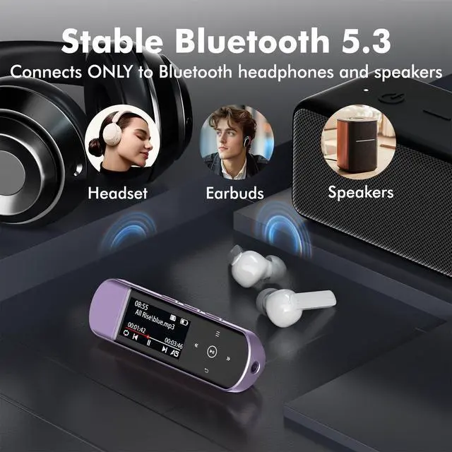 [USB MP3 Player with Bluetooth 5.3 & Clip] Enjoy smooth audio with the USB MP3 Player with Bluetooth 5.3. Pairs quickly and stays connected to wireless headphones or speakers. The USB MP3 player with clip Jam is easy to attach to clothes or bag, keeping hands free while running, hiking, or working out.