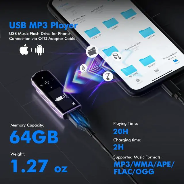 Note: Use an OTG cable or adapter, and make sure your phone supports OTG. For best results, transfer files in batches under 1GB ^^ [HiFi Sound Quality & Multiple Play Modes] Enjoy clear, crisp sound for an immersive audio experience with this USB music player with Bluetooth. Choose from shuffle, playlist loop, sequential play, folder repeat, and more to customize your music experience. This Bluetooth MP3 player with clip is compatible with MP3, WMA, APE, FLAC, WAV, DRM, ACELP and OGG, providing the flexibility to meet all your music needs ^^ [USB MP3 Player with Voice Recorder, FM Radio, Line-in] All in one device for music lovers! Resume playback, Equalizer, bookmarks, file folder, volume limit, line-in function (record music directly from phone to the portable music player with Bluetooth), etc. Plus, the USB stick MP3 player can be used as a flash drive. The digital audio player USB is a great gift for seniors, father, mother or friends. Ideal exercise companion for jogging, riding, climbing, or outdoor activities