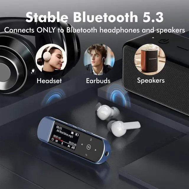[USB MP3 Player with Bluetooth 5.3 & Clip] Enjoy smooth audio with the USB MP3 Player with Bluetooth 5.3. Pairs quickly and stays connected to wireless headphones or speakers. The USB MP3 player with clip Jam is easy to attach to clothes or bag, keeping hands free while running, hiking, or working out.