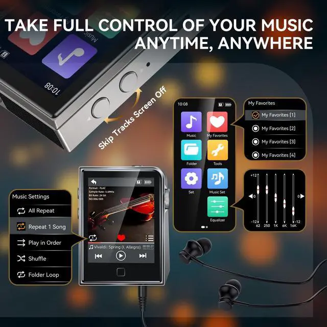 playback modes: Shuffle, Repeat One, Folder Loop, Sequential or All. Skip tracks screen off make the hifi lossless audio player mp3 easy to enjoy high resolution music while jogging or working ^^ [Large Storage & Touchscreen] 64GB internal memory, the hi res mp3 player is expandable up to 128GB MicroSD card, 2-inch HD IPS touchscreen & Home button for effortless navigation. Carry thousands of high resolution tracks for workouts or long flights with the hi-res audio player ^^ [More than a HiFi MP3 player Touchscreen] Stay organized with a stopwatch, calendar, volume limit, date & time display, 21 languages, sleep timer, and power-saving shutdown, etc. Ideal High Resolution MP3 player for kids, adults, seniors, travelers and anyone who loves music without distractions