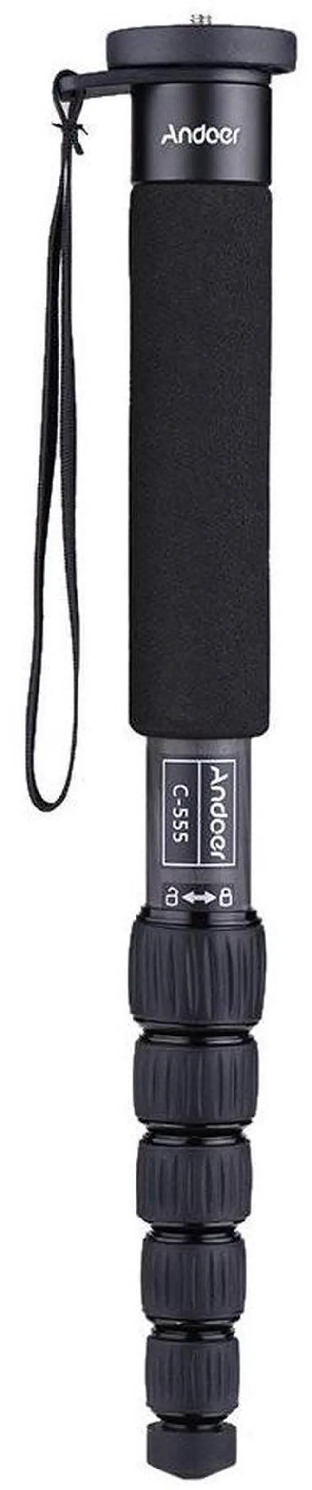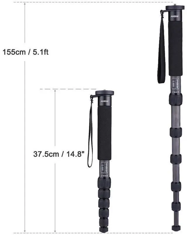 Andoer C-555 monopod, with its strong structure, the load capacity is up to 10kg/22Lbs. This makes it not only a monopod, but a hiking stick for outdoor travel. 6-section extendable design, maximum extended length 155cm/ 5.1 ft; Comes with a carry bag.