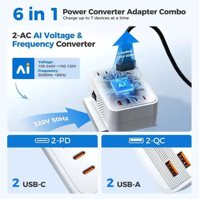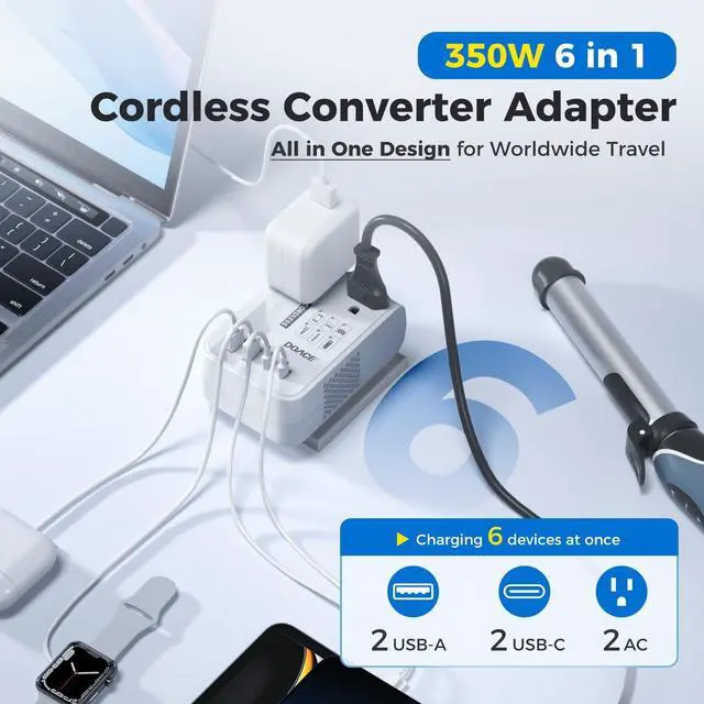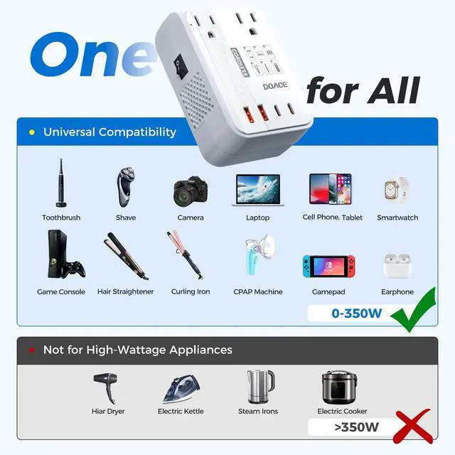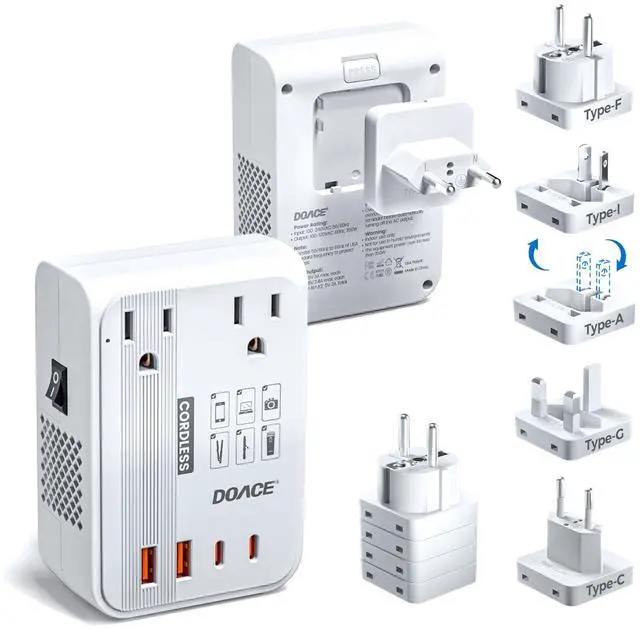 Note: it can't work with Hair Dryer ^^ [Smart AI Voltage & Frequency Control] Our advanced AI chip not only converts voltage (100240V to 110V) but also adjusts frequency from 50/60Hz to 60Hz, ensuring safe, stable performance for your U. S. appliances anywhere in the world. ^^ [30% Smaller & Lighter, 10% Quieter] No one wants bulky luggage. DOACEs compact, cordless design is 30% smaller ( 4.2 in * 2.87 in * 1.57 in) and lighter (only 7.9 oz) than others, and operates 10% quietermaking it the perfect on-the-go companion. ^^ [Charge 6 Devices at Once] Power more at once2 U. S. outlets + 4 USB ports (including 2 PD & 2 QC). Fast-charge your phone, tablet, laptop, and moreall at the same time. ^^ [Worldwide Use Over 200 Countries] The converter comes with 4 interchangeable plugs (EU, UK, DE, AU/US), Note: The Type A and Type I mini plugs can be interchanged with each other the two pins can be rotated to switch between the two plug types, making it your perfect travel partner. Compatible in over 200 countries like the UK, Italy, Germany, France, Australia, China, Korea, and more. Travel smart and stay powered up anywhere. ^^ [Safety First Certified Protection] NRTL safety tested. Built-in protection from overcurrent, overload, overheating, and short circuits. Keeps your U. S. devices safeno more burned-out appliances abroad, Choose DOACE Choose Safety ^^