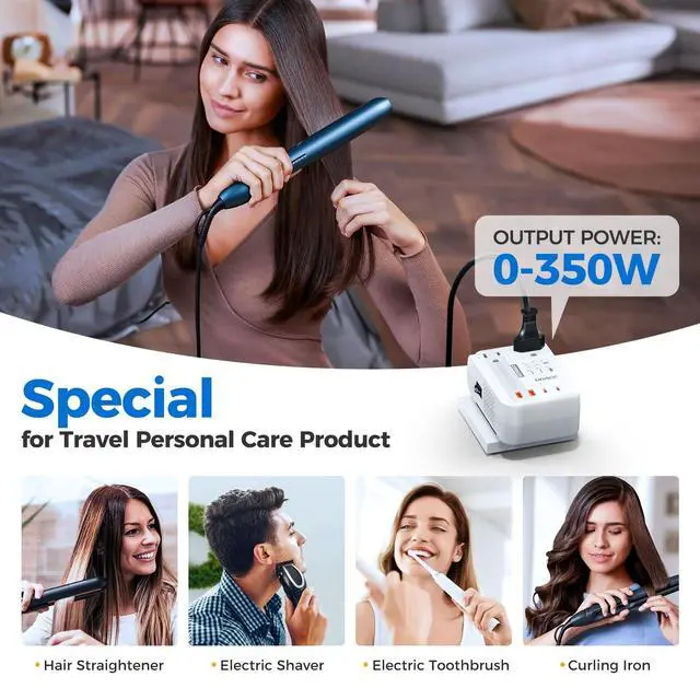 [52% More Power for Travel Essentials] The 350W Power transformer is an essential tool for Americans traveling internationally. Compared to typical 230W converter, it can support 30% more devices. such as hair clippers, electric shavers, toothbrushes, dental flossing machines, beard trimmers, laptops, breast pumps, nebulizers, CPAP machines, Xbox consoles, tablets, game consoles, TVs, and hair straightener, curling iron.
