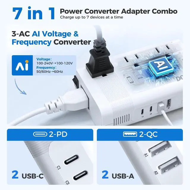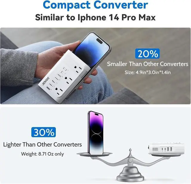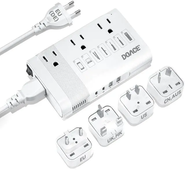 Note: Can't work with hair dryers, kettles. ^^ [Smart Auto-Conversion Tech] Patented AI chip automatically converts 100-240V voltage + 50/60Hz frequency to US-standard 110V/60Hz just plug and play. Safeguards your devices worldwide. ^^ [Ultra-Light & Quiet Design] No one wants bulky luggage. DOACEs compact, cordless design is 20% smaller and lighter (only 7.9 oz) than others, and operates 10% quietermaking it the perfect on-the-go companion. ^^ [7-in-1 Travel Power Converter Adapter Combo] Charge 7 devices at once: 3 US AC outlets + 2 PD USB-C + 2 QC USB-A ports. Fast-charge your phone, tablet, and moreup to 2X faster than standard USB. No more fighting over outlets while traveling! ^^ [Global Ready 190+ Countries] Comes with EU power cord + 4 travel plug adapters (US, UK, AU, EU). Works worldwide in France, Germany, Ukraine, Thailand, Bali, Vietnam, Canada, Mexico, Germany, Japan, China, Korea, India, Italy, Brazil, Europe, Asia, Israel, Antigua and Barbuda, Bulgaria, Cambodia, Dubai, UK, Fiji, Guam, Haiti, Hong Kong, Ireland, Malaysia, New Zealand, Peru, Puerto Rico, Singapore, Egypt, Turkey, and more., it's your all-in-one power solution abroad. ^^ [Tested Safe, Trusted Quality] NRTL-tested with advanced safety featuresoverheat, overload, short circuit protection. Keeps your devices and your peace of mind safe anywhere you go.