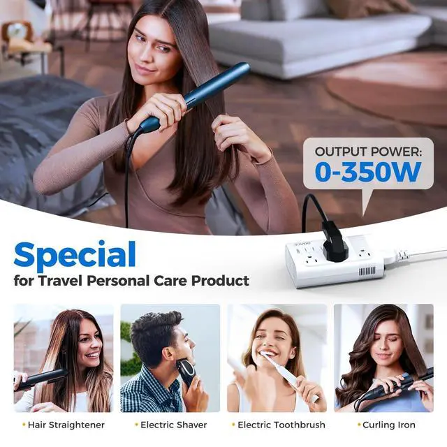 [Upgraded 52% More Power Converter for Most Travel Essentials] Compared to standard 230W converters, our 350W transformer powers 30% more devices: Laptops, tablets, Xbox, CPAP machines, nebulizers, breast pumps, and hair straightener /curling iron.