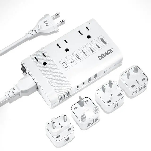 Note: Can't work with hair dryers, kettles. ^^ [Smart Auto-Conversion Tech] Patented AI chip automatically converts 100-240V voltage + 50/60Hz frequency to US-standard 110V/60Hz just plug and play. Safeguards your devices worldwide. ^^ [Ultra-Light & Quiet Design] No one wants bulky luggage. DOACEs compact, cordless design is 20% smaller and lighter (only 7.9 oz) than others, and operates 10% quietermaking it the perfect on-the-go companion. ^^ [7-in-1 Travel Power Converter Adapter Combo] Charge 7 devices at once: 3 US AC outlets + 2 PD USB-C + 2 QC USB-A ports. Fast-charge your phone, tablet, and moreup to 2X faster than standard USB. No more fighting over outlets while traveling! ^^ [Global Ready 190+ Countries] Comes with EU power cord + 4 travel plug adapters (US, UK, AU, DE). Works worldwide in France, Germany, Ukraine, Thailand, Bali, Vietnam, Canada, Mexico, Germany, Japan, China, Korea, India, Italy, Brazil, Europe, Asia, Israel, Antigua and Barbuda, Bulgaria, Cambodia, Dubai, UK, Fiji, Guam, Haiti, Hong Kong, Ireland, Malaysia, New Zealand, Peru, Puerto Rico, Singapore, Egypt, Turkey, and more., it's your all-in-one power solution abroad. ^^ [Tested Safe, Trusted Quality] NRTL-tested with advanced safety featuresoverheat, overload, short circuit protection. Keeps your devices and your peace of mind safe anywhere you go.