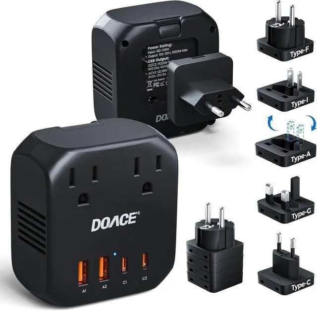 Note: Not for Dyson hair tools or any appliance rated over 2000W. ^^ [Worldwide Use Works in 200+ Countries] The DOACE globle universal travel adapter converter comes with 4 interchangeable plugs (EU, UK, DE, AU/US), Note: The Type A and Type I mini plug can be interchanged with each other the two pins can be rotated to switch between the two plug types. making it your perfect travel partner. Compatible across Europe, UK, Australia, Asia, the Middle East, and more than 200 countries worldwide. Ideal for charging all your devices wherever your journey takes you. ^^ [High-Speed Charging Simultaneous for 6 Devices] Equipped with 2 US standard transformer sockets and 4 USB ports, it can power 6 electronic devices simultaneously, ensuring you don't miss out on exciting content while traveling due to charging. Among them, 2 PD ports and 2 QC USB-A ports accelerate charging for your phones, tablets, and other USB charging devices. ^^ [Safety First Certified Protection] NRTL safety-tested with multiple safeguards: overcurrent, overload, overheating, and short-circuit protection. Keeps your U. S. devices safe abroadno worries about damage or burned-out appliances. Choose DOACE, choose peace of mind.