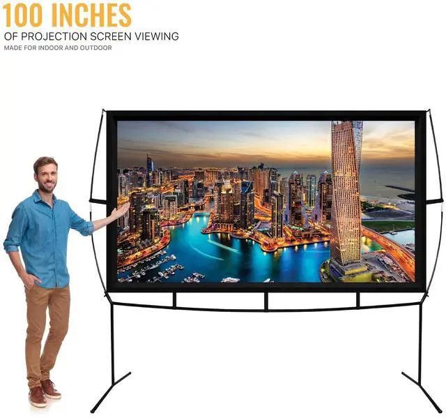 Do Not Buy Another Stand Alone Projector Screen Until You Read This! Are you looking for a premium quality outdoor movie projector screen for your family movie nights? Introducing The Ultimate Portable Projector Screen By KHOMO GEAR! Now you don't have to settle for flimsy, cheaply-made projector screens that arrive broken or with missing pieces. The Khomo Gear Jumbo 100'' portable outdoor projector screen allows you to enjoy home cinema, screen films outdoors, and add pizzazz to presentations. Why bother with a small screen when you can see more detail and generate a fun atmosphere with a huge one? Whether you are using your projector for corporate presentations, movies, or a wedding photo slideshow, this indoor and outdoor screen provides you with excellent image quality.