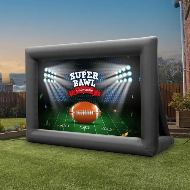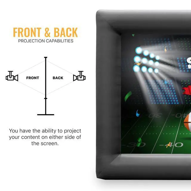 Large Viewing Area Enjoy a 11.6. 5 ft. projector screen with a 16:9 aspect ratio for immersive outdoor movie screen nights. The semi-opaque polyester + spandex material stays smooth when inflated and supports both front and rear projection, delivering a clear, spacious viewing experience for projector screen indoor or projector screen outdoor use. ^^ Front and Back Projection Capabilities This projection screens fabric supports front projection (generally brighter) and rear projection when you want the projector hidden behind the screen. Compatible with LED, LCD, DLP, and laser projectors of any size, from portable to high-brightness models.