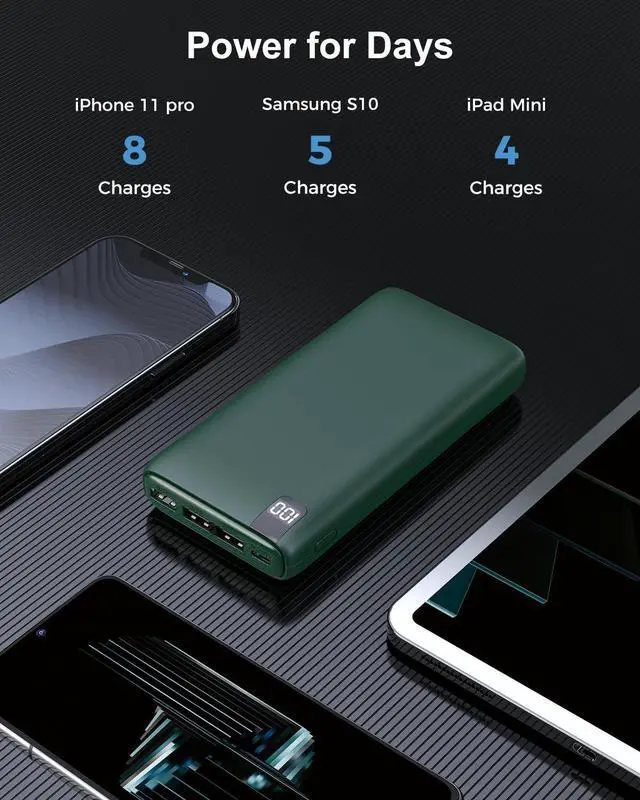 26800mAh Huge Capacity: 26800mAh power bank can charge most phones for 8-10 times and other USB devices multiple times for an average of 9 days of unrestrained usage per charge, and no need to worry about losing contact with anyone due to out of power.