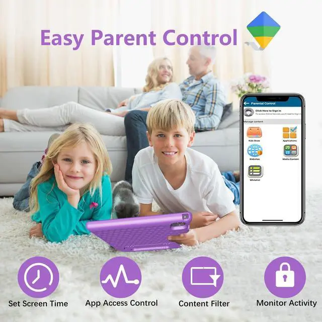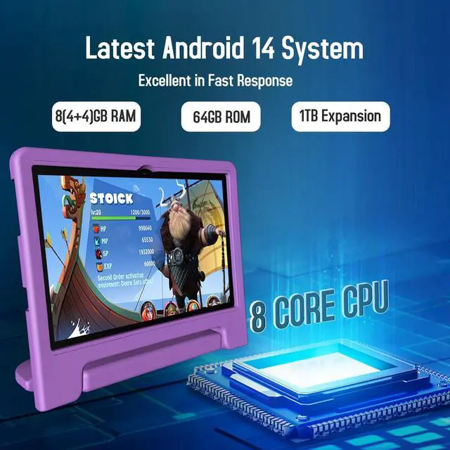 Parental Control ModeAndroid 14 tablet is specially designed for kids with the google kids space for music, drawing, learning, stories, calculations, games and more. Parents can set separate profiles for each kid, add or block apps, set screen time limits, and lock their kids tablets