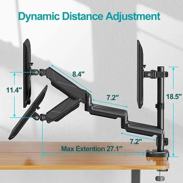 Full Motion Gas Spring Monitor Arm - This triple monitor stand features tilt +90°/-90°, swivel +90°/-90°,rotate 360 and height adjustment.Customized your view angle with the articulating arms, offering the best viewing angle and more comfort.