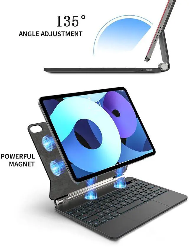Magnetic 135° Angle Adjustment & Portability - Powerful magnets align perfectly with iPad cameras. Adjustable metal hinge offers stable viewing up to 135°. All-in-One