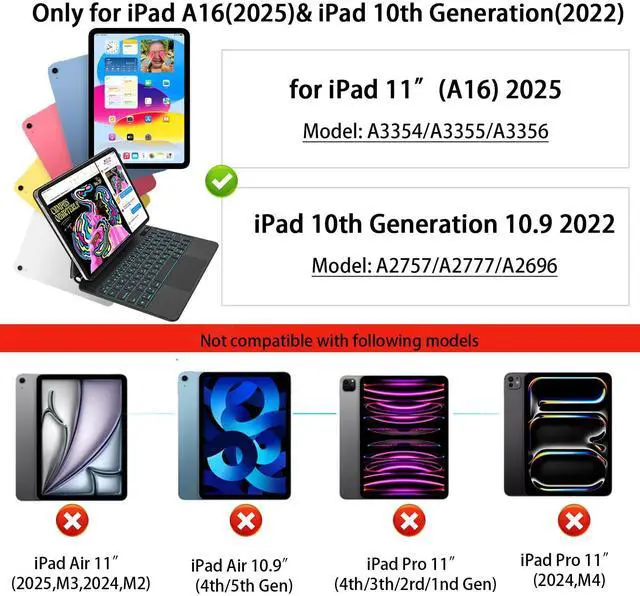 Perfect Fit for iPad A16 (2025) &10th (2022)Models: Only compatible with iPad 11th A16 (A3354/A3355/A3356) and iPad 10th Generation 10.9" (A2757/A2777/A2696). Not for iPad Air/Pro models. Pro Tip: Please Check your iPad model number (on the back) for a perfect fit. iPad & S Pen not included.