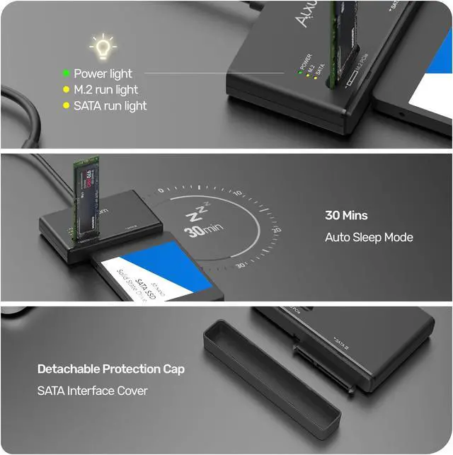Tool-free Plug and Play NVMe m.2 to SATA adapter is so easy to use without any tools and no driver required, Simply open the dust cover of the USB Drive Case to insert a SATA SSD, M2 SSD can be inserted directly into the external NVMe enclosure, and the open design is compatible with any size of M.2.