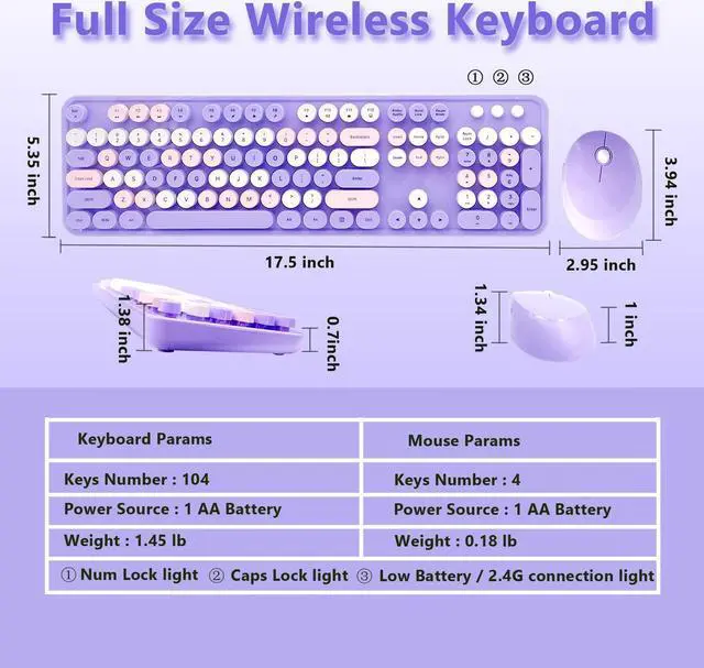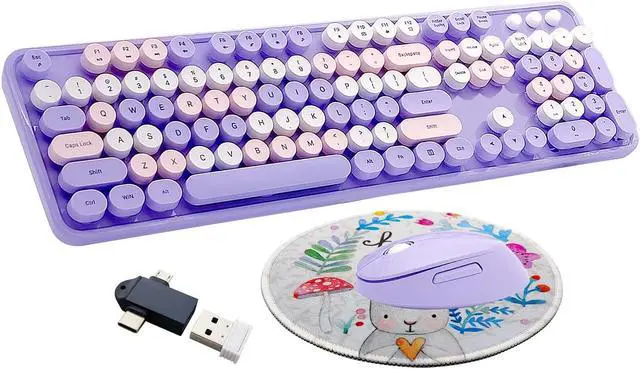 Seaciyan Wireless Keyboard and Mouse Combo, Ergonomic Cute Retro Typewriter Full Size Colorful USB Cordless Keyboard Mouse Set for Gaming and Office (Purple)