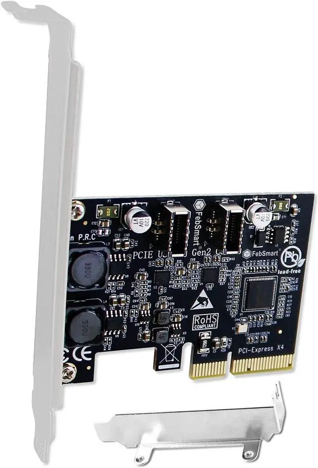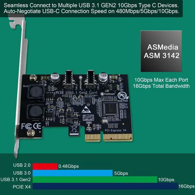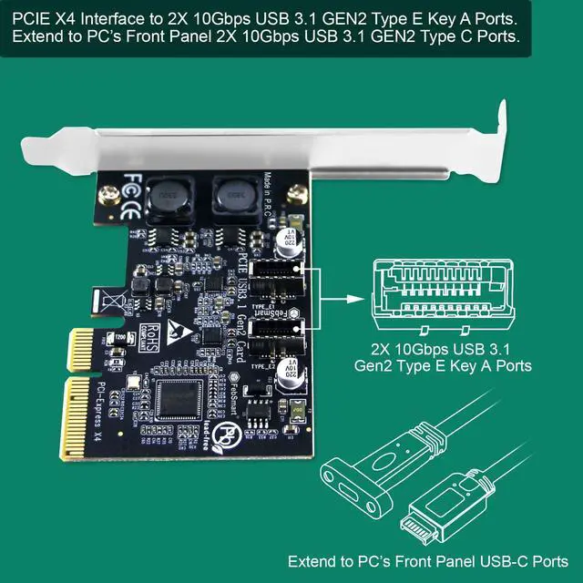FebSmart PCIE X4 to 2X 10Gbps Max Speed USB 3.1 GEN2 Type E Key A Ports Card, USB 3.1 GEN2 10Gbps Header for Desktop PCs Front Panel USB-C Ports, Built in Self-Powered Technology (FS-E2C-Pro)