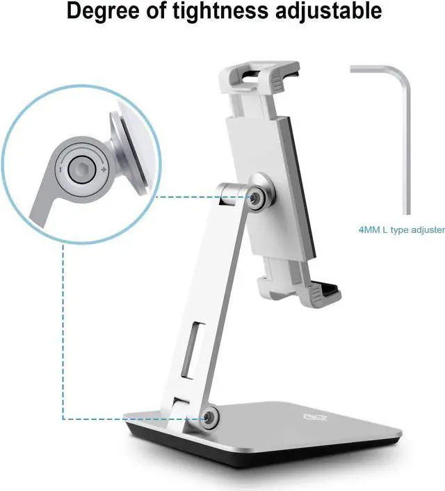 -ADJUSTABLEUse the 4 mm Allen Wrench under the tablet stand to adjust the degree of tightness. Once you set up a degree of tightness, It would be as sturdy as you want. And the angles are adjustable. Supporting both vertical and horizontal viewing.