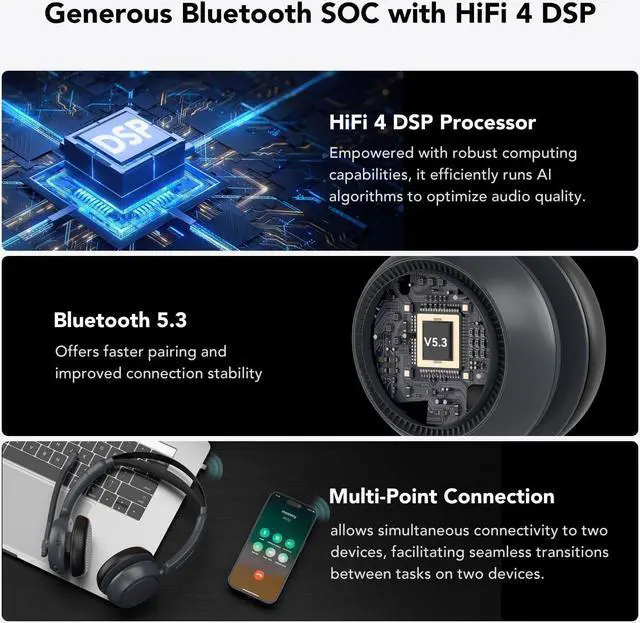 Bluetooth 5.3 & Multi-Point Connection: Enjoy swift pairing and enhanced connectivity with Bluetooth 5.3 technology, elevating your wireless experience. With a remarkable range of up to 33 feet, the HP31DU lets you move freely while maintaining premium sound quality. The Bluetooth multi-point connection allows simultaneous pairing with two devices, effortlessly switching between computer meetings and incoming phone calls.