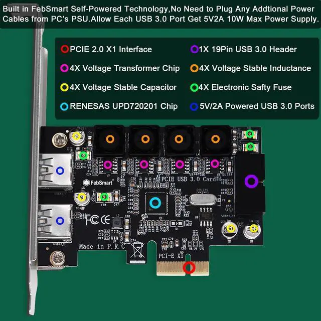 2. Built in FebSmart Self-Powered Technology, users do not need to plug any additional power cable from PCs power supply unit. Allow each 5Gbps USB-A port get 5V/2A max (5V/8A in total) power supply for high-power consuming USB 3.0 devices (NOT support fast charging) such as USB industrial cameras, USB VR-Systems, USB 3.0 NVME enclosures, USB live broadcast devices, USB 3.0 SSD/HDD enclosures, USB 3.0 video adapters and USB 3.0 universal docking stations.