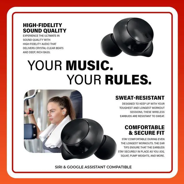 SWEAT RESISTANT Thoughtfully crafted to divert sweat and moisture from the earbuds internal components, keeping them dry and functional, even during heavy exercise. Embrace your active lifestyle with confidence, knowing that the Coby Pro Buds are engineered to keep up with you and deliver superior sound quality throughout your entire fitness journey.