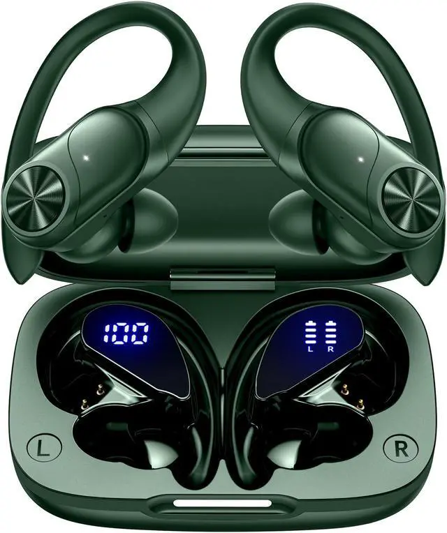 PocBuds Bluetooth Headphones Wireless Earbuds 80hrs Playtime Wireless Charging Case Digital Display Sports Ear Buds with Earhook Deep Bass IPX7 Waterproof Over-Ear Earphones for TV Phone Laptop Olive