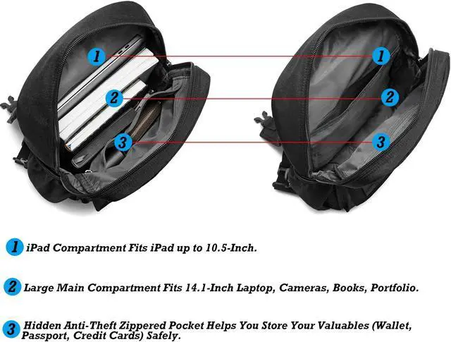 Compartment: 1 open pocket is under the flap; 2 side pockets. The main compartment is fitted with zipper: 1 inner zipper pocket, 1 inner iPad pocket, and 1 inner laptop pocket.