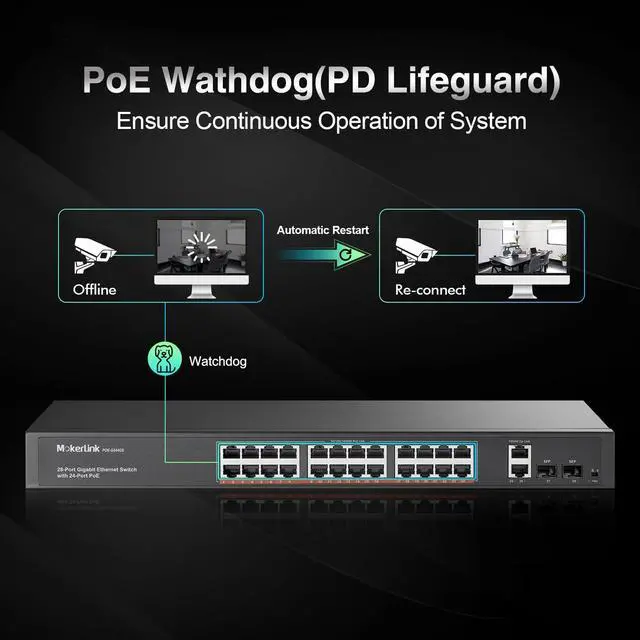 28 Gigabit Ports: 24 Gigabit POE+ ports, 2 Gigabit Ethernet UpLink, 2 Gigabit SFP. Switching capacity is 56Gbps, each port can reach 1G rate at the same time, with high speed transmission; 2 SFP UpLink, can be more flexible and long distance to connect to different network devices, such as routers, switches, servers, etc.