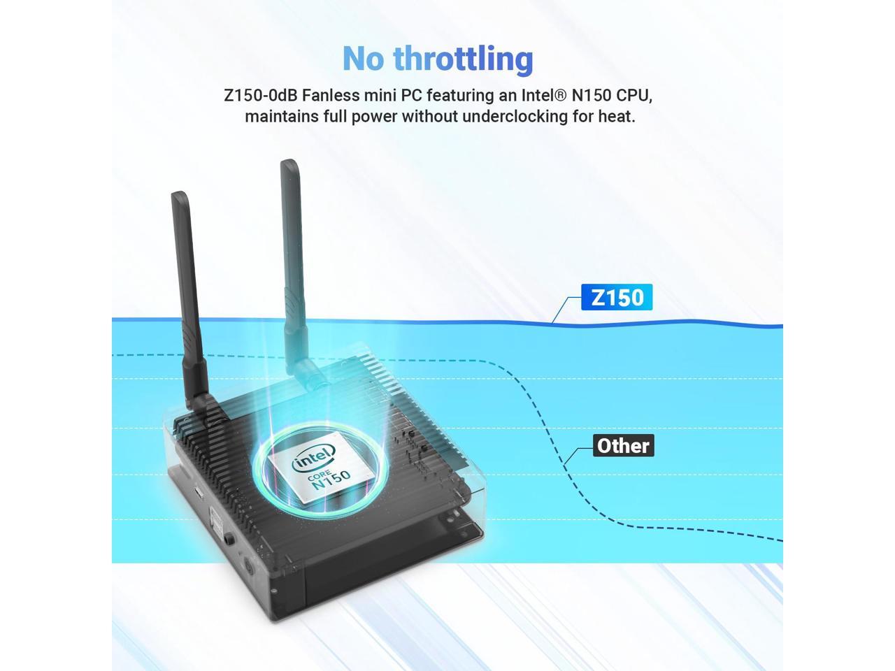 - [Fanless passive cooling design] Z150-0dB fanless miniPCs excel in scenarios prioritizing noise reduction, reliability, low maintenance, dust-free operation, no vibration, energy efficiency, and a compact form factor. Their versatility makes them ideal for home entertainment, office settings, industrial applications, and environments highly sensitive to noise pollution