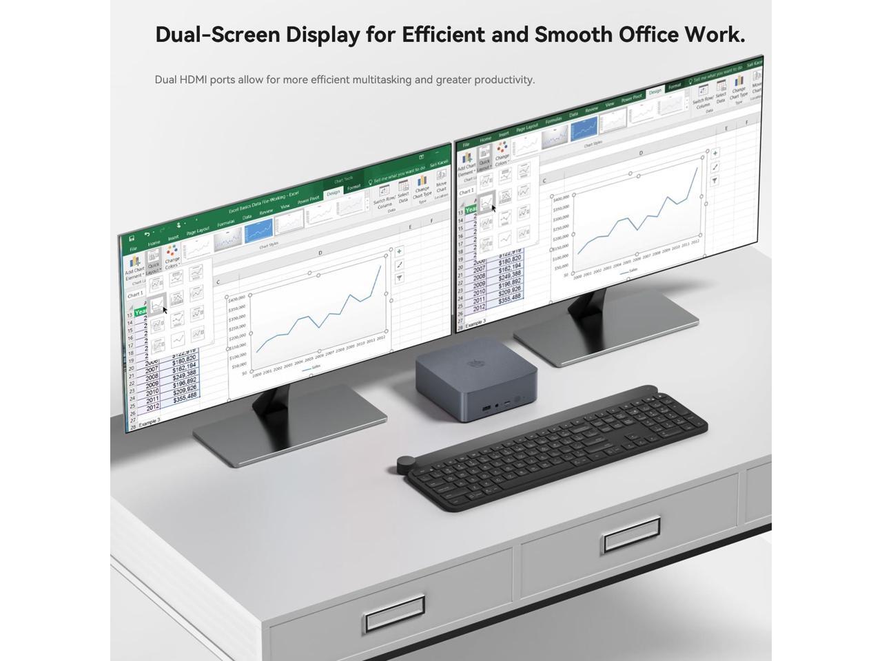 - Support 4K & dual screen displayThe mini desktop computer equipped with 2*HDMI port, ,makes it easy to connect two monitors at the same time, and you can do mulit-tasking, which will improve your work effeniency.
