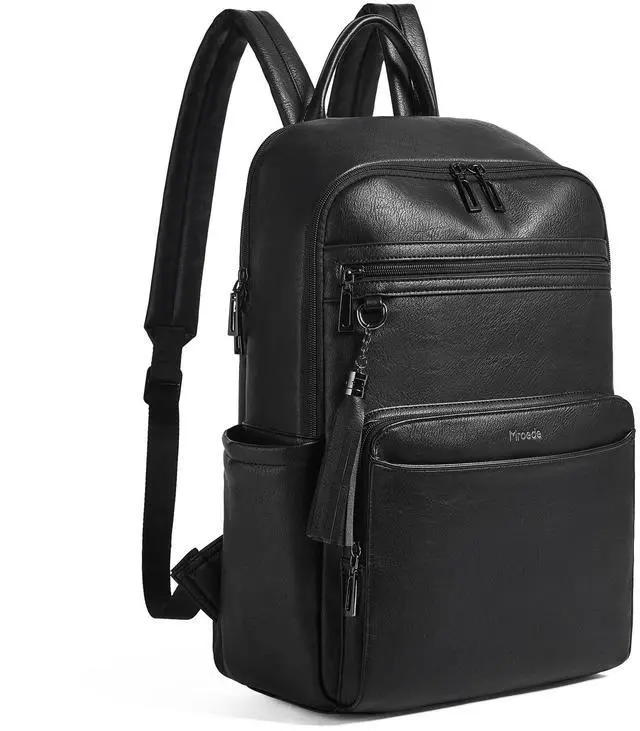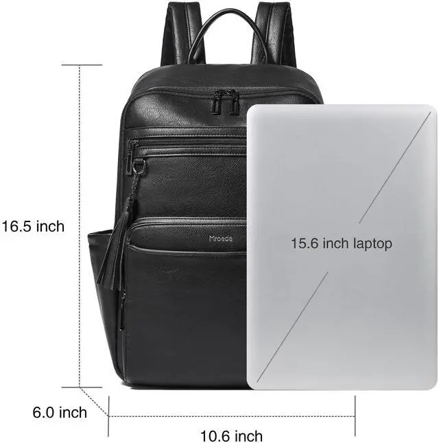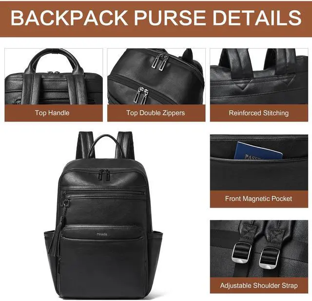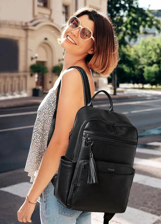 Multi-Pockets Laptop Backpack for Women : Large capacity work backpack woman has 12 pockets, easy to organizing daily necessities such as laptop,iPad,A4 files,books,kindle,phone,chargers,umbrella,water bottle,wallets,and everyday items. Laptop backpacks suitable for various scenarios,including work,business,travel,commuting,college,daily use. This leather backpack only can water-resistant against light rain and splashes (not suitable for immersion or prolonged heavy rain).