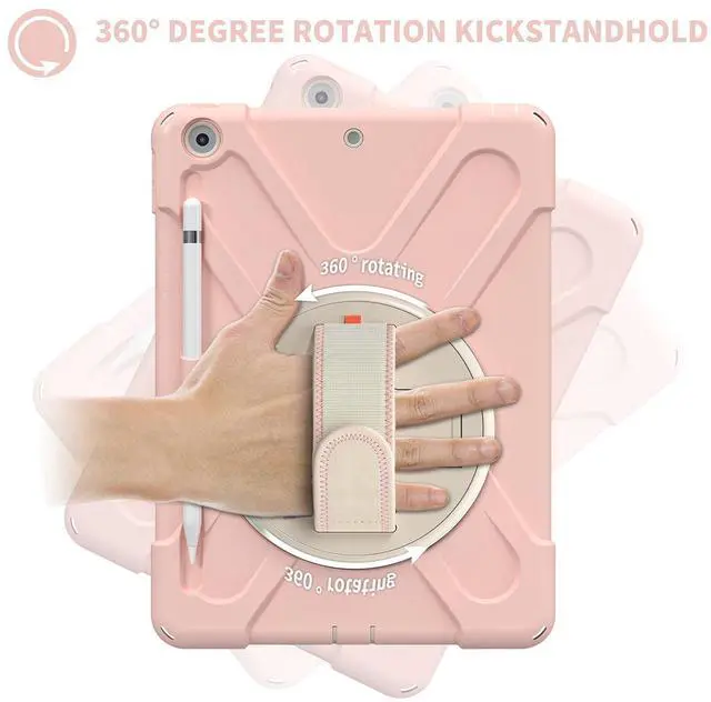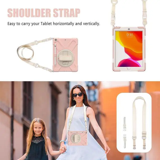 FEATURES: Built-in Kickstand is 360 degree rotating, you can adjust your 10.2 inch iPad to whatever angle you want, perfect for watching videos and chatting; Built-in elastic Pencil Holder makes it easy to pull out and store your Apple pencil store your Apple Pencil Adjustable velcor hand strap allows big hand and small hand, perfect for kids and adults. Adjustable and detachable Shoulder belt is very convenience, safe and fashion you can carry tablet with should belt wherever you want