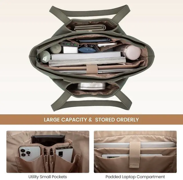 Spacious & Practical Design Measuring 15 x 5.5 x 12 inches, this womens tote bag features a roomy main compartment, a padded 15.6-inch laptop pocket, two slip pockets, and a zippered pocket. Its perfect for iPad, papers, files, headphones, and more, ensuring your essentials are organized and accessible.