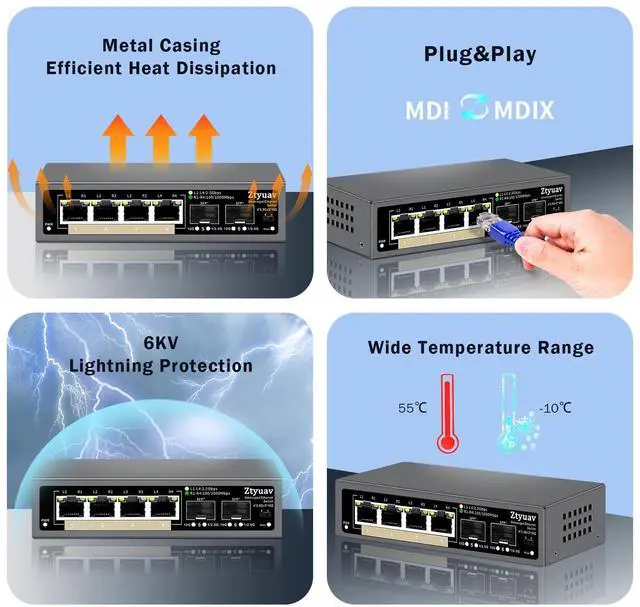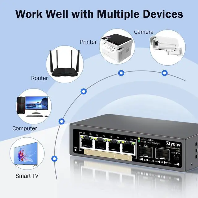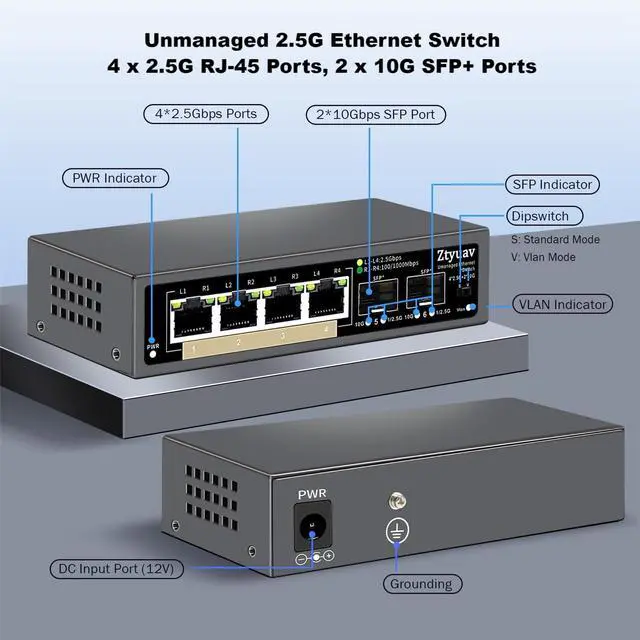Ztyuav 6 Port Unmanaged 2.5G Ethernet Switch with 4 x 2.5G RJ-45 Base-T Ports, 2 x 10G SFP+, Ports Speed Auto-Negotiation-100/1000/2500Mbps, One-Key VLAN, Plug & Play, Fanless & Metal