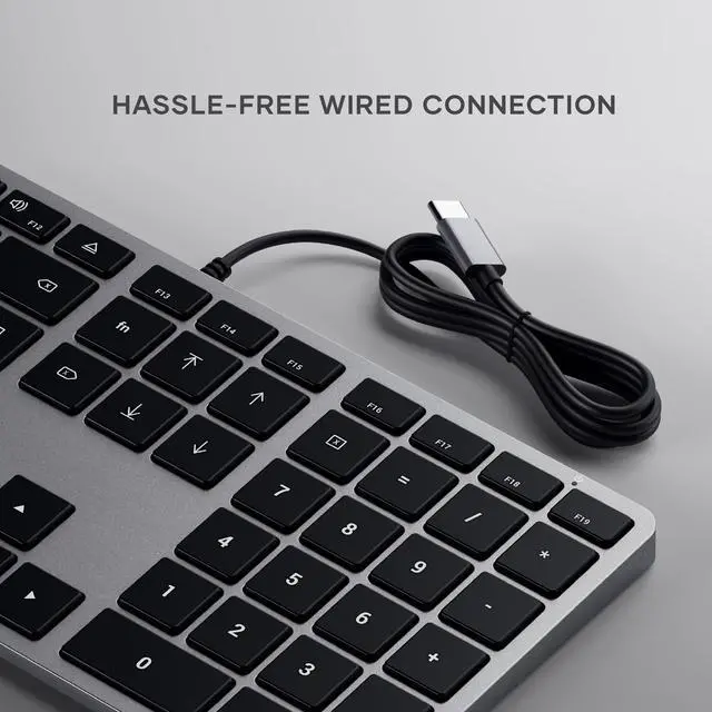Mac Optimized Wired Keyboard - Meticulously crafted for Apple users, enjoy a QWERTY extended layout with a numeric number pad, seamless wired USB C connection, and MacOS function keys, all wrapped in a sleek aluminum finish.
